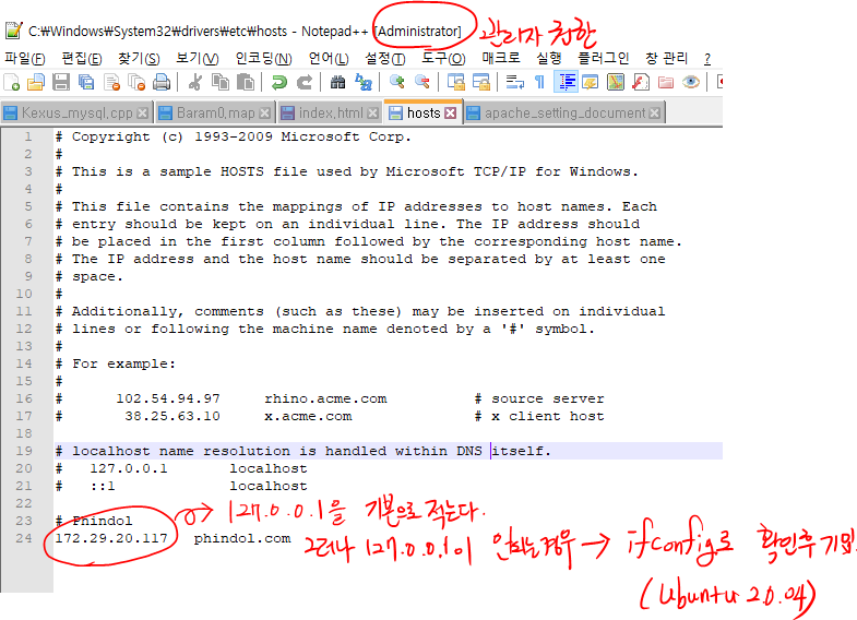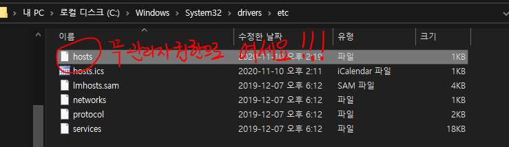 그러나 우리는 해당 도메인을 구매하여 구비하지 않았기 때문에 실제로 테스트를 할 수 없다. 이러한 경우 윈도우의 host 파일을 수정하여 나의 컴퓨터 내에서 해당 도메인에 대한 접속을 바꿔주는 것이다.