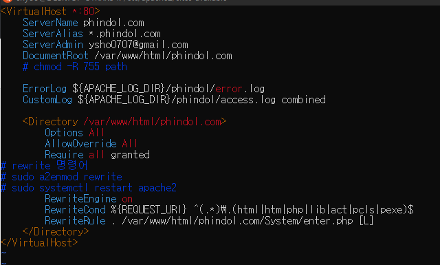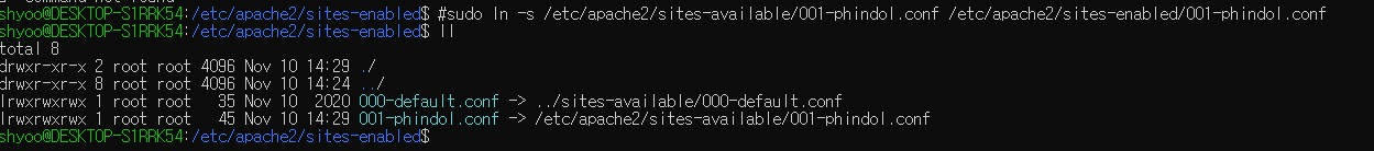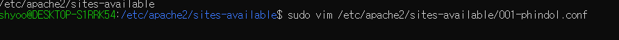 sudo a2ensite phindol(sites-available, enable등에서 지정했던 이름 ex] 001-phindol.conf 에서의 phindol)