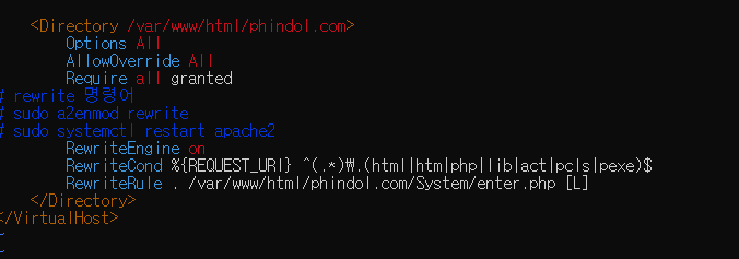 RewriteEngine ~ RewiteRule 까지가 본인이 정한 Rewrite 룰인 것이다. 저 룰이 실행되려면 다음과 같은 명령을 명령 라인에 실행한 뒤 아파치를 재실행 하면 된다.