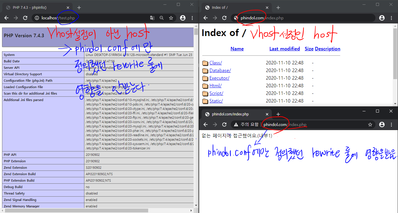 왼쪽은 http://localhost/ 도메인으로 vhost 설정이 되지 않은 메인 host이고 오른쪽은 vhost 설정이 된 가상 host이다. vhost 설정을 하면서 rewrite라고 하는 주소를 고쳐쓰는 모듈을 설정했는데 왼쪽과 오른쪽에서 rewrite 모듈이 실행 안되고/되고 의 결과를 본다면, vhost 설정을 통해 하나의 아파치 웹 서버에서 서로 독립적인 사이트처럼 실행된다는 사실을 확인할 수 있다.