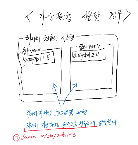 꿀이다. 싸울 필요가 없다. 하나의 공간을 논리적으로 나누어서 철수의 영역, 영희의 영역 서로 다른 버전의 a 패키지를 따로 따로 설치하여 실행도 따로따로 한다. 이 때 실행할 때에는 가상 환경을 사용하지 않을 때와 다르게 약간의 조치가 필요하겠지만 (빨간 ㄱ 표시) 매일 지우고 깔고 싸우고를 반복하는 행위에 비하면 아무 문제가 되지 않는다.