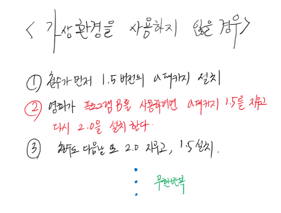 철수와 영희는 매일 싸울 것이다. 매 오전/오후 수업마다 서로의 a 패키지를 계속해서 설치했다가 지웠다가를 반복하기 때문이다. 그렇다면 가상 환경을 사용하게 되면 어떻게 될까?