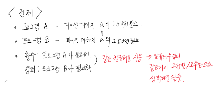 철수와 영희는 각각 파이썬으로 이루어진 프로그램 A와 프로그램 B를 실행하려고 한다. 그런데 이 프로그램 A와 B는 a라는 파이썬의 패키지를 사용하지만, 각자 원하는 버전이 다른 것이다. 버전이 다르면 실행이 불가하다는 전제를 둔다. 그런데 철수는 컴퓨터 수업의 오전 반, 영희는 컴퓨터 수업의 오후 반인데 안타깝게도 자리마저 동일한 자리라서 같은 컴퓨터를 사용한다.