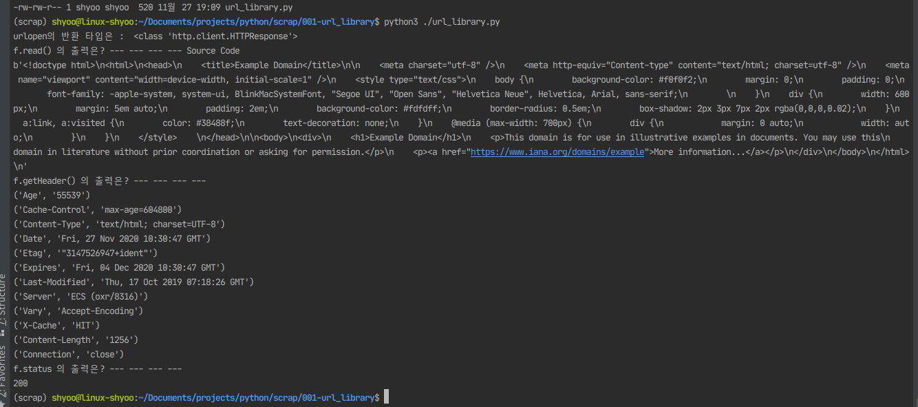 기본 내장된 url library를 이용하여 간단하게 웹 코드 및 헤더 정보, 상태 코드 읽어오는 예제이다.