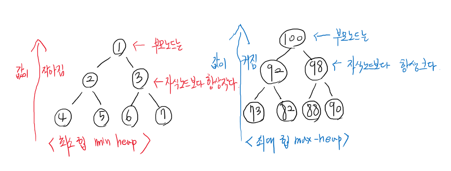 즉, 힙의 루트 노드는 삽입, 삭제 과정에서의 힙 자료구조의 재조정을 통해 각 힙에서 지정한 규칙에 의거하여 우선 순위가 높은 값으로 채워넣어진다.