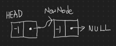 새 노드가 항상 헤드 다음 즉, 실질 데이터 노드 맨 앞에 항시 존재해야만 한다. 값을 추가할 때, 값과 링크 값만 변경하고 사용한다. 위와 같은 특성 때문에 리스트를 초기화할 때 다음 그림과 같이 꼭 -1 값으로 초기화 한다.