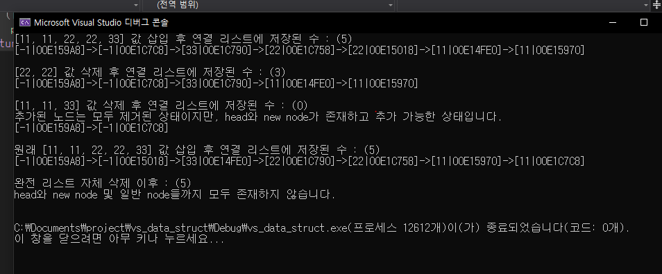 printf("[11, 11, 33] 값 삭제 후 연결 리스트에 저장된 수 : (%d)\n", LCount(&lm));