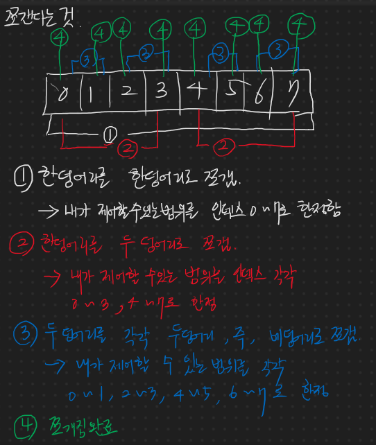 제어할 수 있는 인덱스 범위를 한정지으면 되겠다 이것이다. 그런데 내가 가만히 보니 이 쪼개는 단계가 범위만 줄어드는 것 외에는 모두 같은 짓을 하고 있는 것이다. 그렇다면 원본 배열을 던지고, 그와 함께 범위 값만 다르게 던져주면 알아서 쪼개주는 함수가 없으려나?