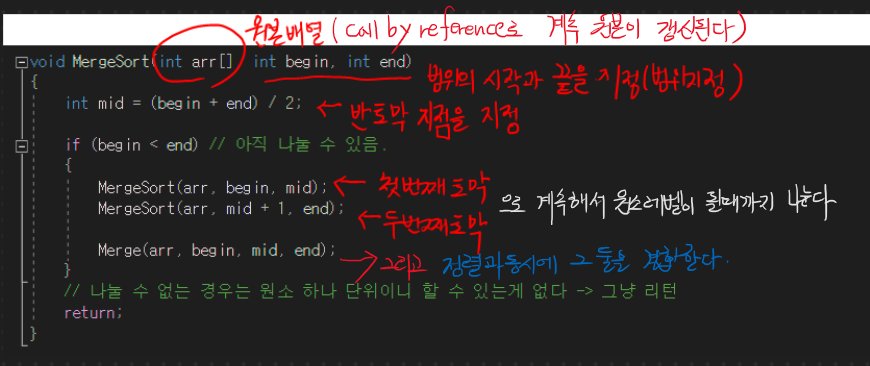 물론!!!! 여기서 정렬은 조상님이 와서 대신 해주는게 아니다! Merge라는 함수 내에서 이를 구현해야한다. 이는 어렵지 않으므로 코드로 확인해보면 될 것이다.