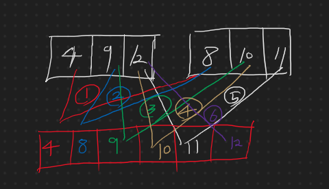 이 코드가 핵심인데, 앞 범위 토막과 뒷 범위 토막의 요소들을 모두 둘둘씩 비교하여 작은 값을 새로운 공간에 차곡차곡 넣는 방식이다. 이게 가능한 이유는 각 토막들은 아래 계층에서 이미 정렬되어 올라왔기 때문이다! (쓰면서 명확히 깨달음 ㅋ)