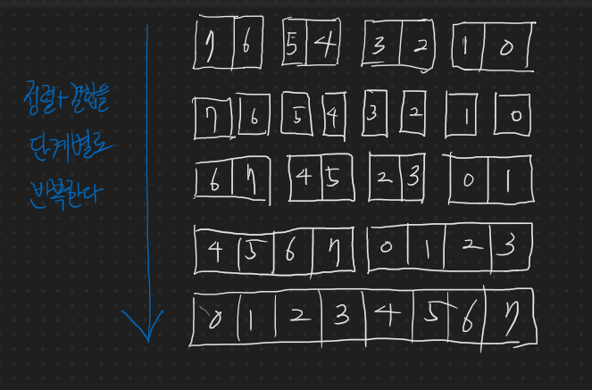 2. 다시 단계적으로 정렬과 동시에 결합을 반복한다.