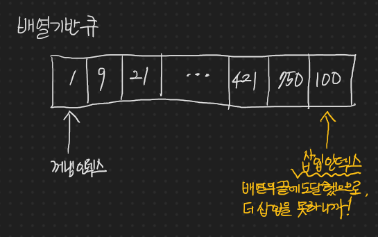 이 경우이다. 삽입 인덱스가 끝까지 가서 삽입 후 증가를 해야하는데 증가를 하려는데 증가가 안된다. 왜냐하면 인덱스가 끝에 왔기 때문이다. 이 경우 우리는 꽉 찼음을 확인한다.