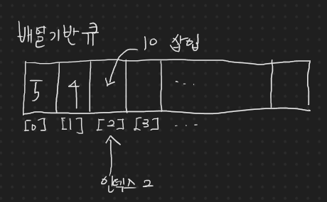 단순 배열 기반의 큐에서 삽입 연산을 하는 것은 어려울 것이 없다. 배열의 끝에 값을 추가하듯이 인덱스를 증가시켜가면서 값을 넣으면 된다. 다음과 같이 말이다.