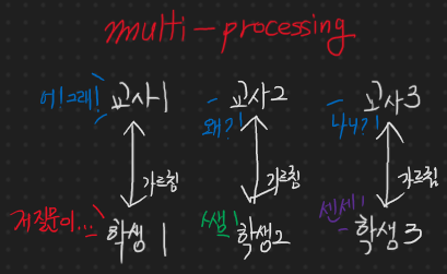 멀티 프로세싱 모델을 비교한 것이다. 학생에게 마치 과외 선생님처럼 교사가 할당되어, 학생에게서 질문이나 요구를 받아서 그에 따른 대답을 해준다.