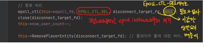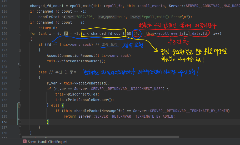 이어서, 접속 요청이나 데이터 수신을 위해 epoll_wait 함수를 호출하는 부분이다