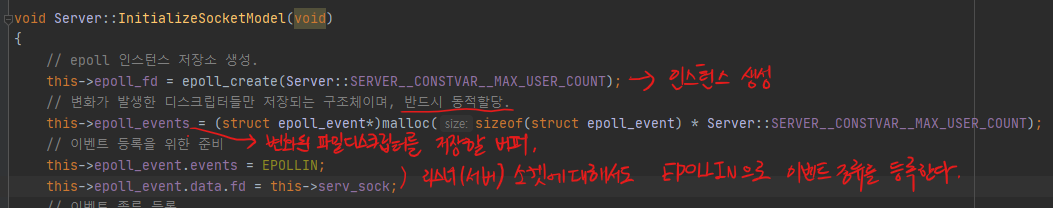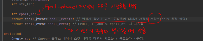 struct epoll_event* epoll_events; // 변화가 일어난 디스크립터들에 대해서 저장할 저장소(only 동적 할당)