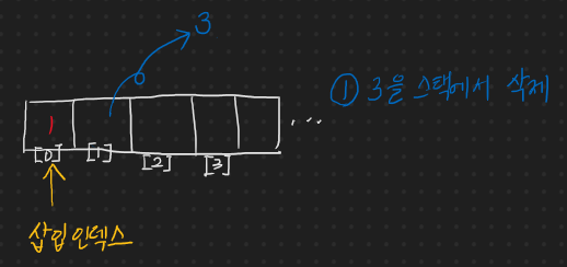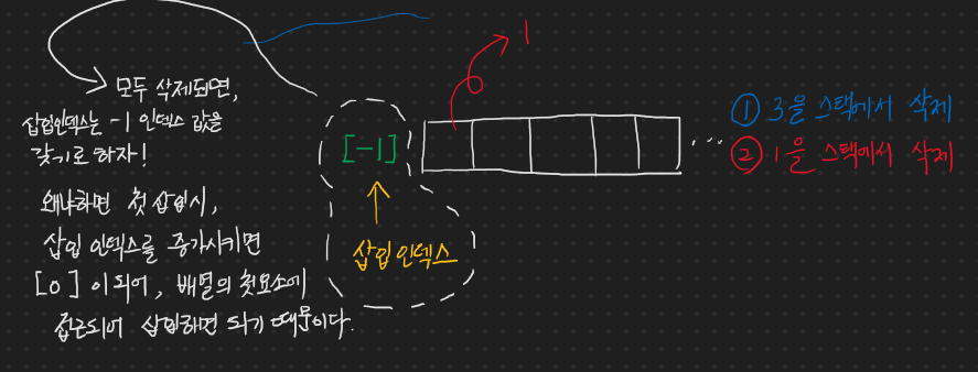 마지막 하나 남은 1이 튀어 나가며 값이 삭제 처리 되고, 삽입 인덱스가 갈 곳을 잃는데 이 때, 삽입 인덱스를 -1로 하자. 그러면 나중에 빈 스택 상태에서 값을 추가할 때, 삽입 인덱스를 증가시키면 [-1] 에서 [0]으로 바뀌어서 자연스럽게 값을 추가하면 될 뿐만 아니라, 스택이 비어있는지 비어있지 않는지 삽입 인덱스가 -1인지 아닌지를 보면 된다.