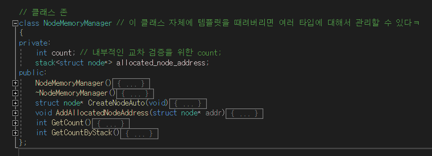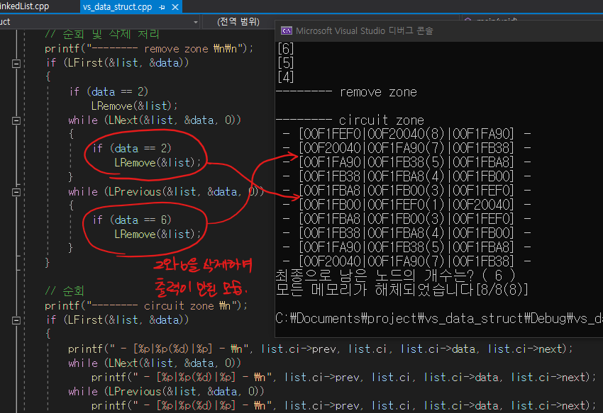 해당 코드에서 또한 메모리 관리 부분이 따로 있기 때문에 삭제 연산 시에도 바로 메모리를 제거 하지 않고 프로그램 종료 전에 한꺼번에 모두 free 시키도록 되어 있다.