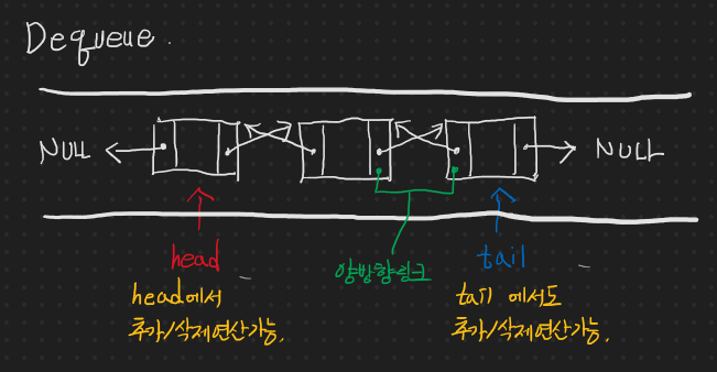 위와 같은 구조이다. 뒤에서도 (tail의 사이드) 추가 및 삭제가 가능해야 하기 때문에 꼭 양방향 링크로 구성이 되어야 한다!!!!!