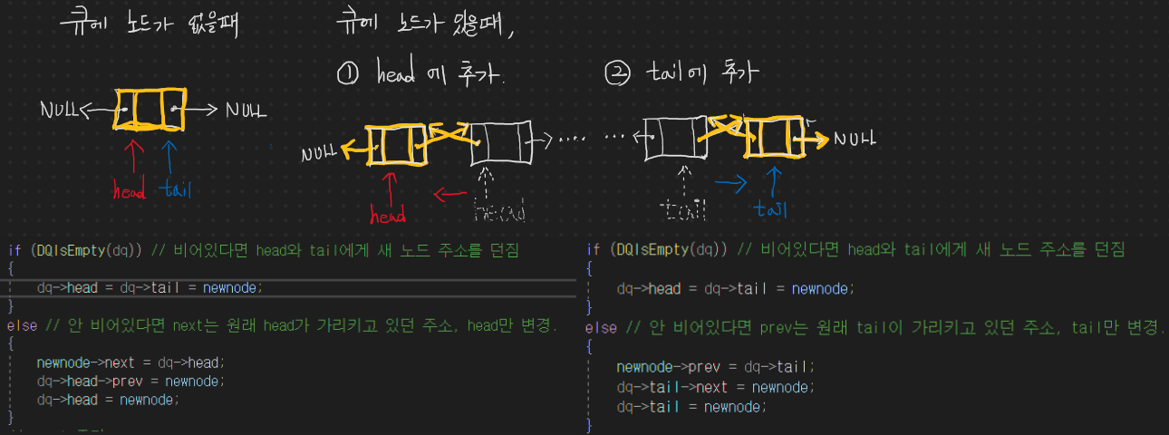 그리고 이러한 초기화에 따라서, Head와 Tail이 NULL 인 경우가 비워진 경우이고, 해당 Dequeue의 꽉 찬 상태는 확인할 필요가 없다. 왜냐하면 연결 기반의 큐이기 때문에 추가하는 수의 제한이 없다고 보면 되기 때문이다.