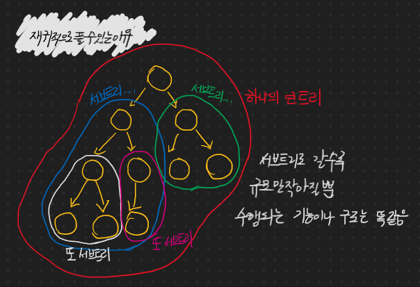 첫 노드인 루트 노드를 기준으로 한 큰 트리가 존재하지만, 첫 노드의 자식을 기준으로 또 하나의 서브 트리가 존재한다. 이 서브 트리를 하나의 대상으로 연산이 이루어지고, 또 그 자식 노드를 기준으로 또 서브 트리가 존재하며 단말 노드가 될 때까지 서브 트리 군이 형성된다. -> 재귀적으로 문제를 풀 수 있다는 것이다.
