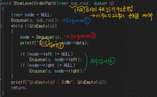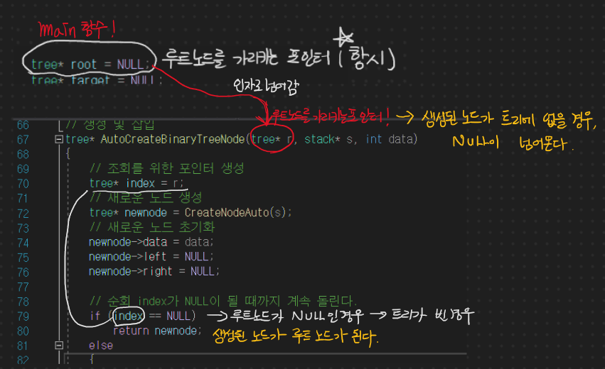 위 코드는 메인 함수 내에서 실행되는 코드로 root 라고 하는 포인터로 트리의 루트 노드를 가리키도록 설계해놓았다.