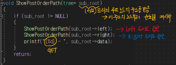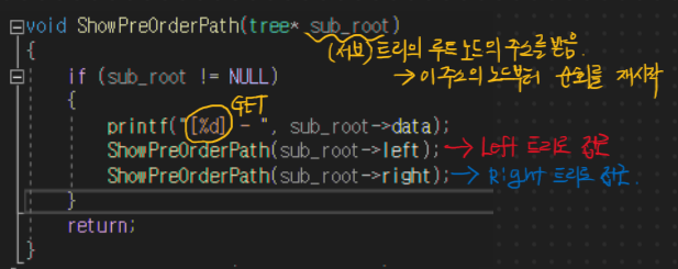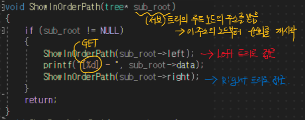 서브 트리의 루트 방문(값 Get) -> 왼쪽 링크를 통한 왼쪽 서브 트리 방문 -> 오른쪽 링크를 통한 오른쪽 서브 트리 방문