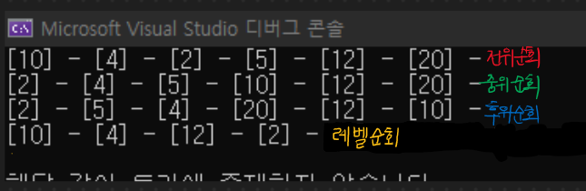 레벨 순회 : 레벨 순회는 레벨 1부터 트리의 말단 리프 노드들이 있는 레벨까지 큐 자료 구조에 순서대로 넣고 출력하여 순회하는 간단한 순회 법이며, 레벨 순서 & 왼 -> 오 순으로 순회가 이루어진다.