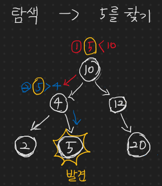 위와 같이 서브 트리를 대상으로 옮기고, 또 서브 트리의 서브 트리로 대상을 옮기고 하는 과정에서 봤을 때, 재귀로 해결할 수 있다! 탐색 또한 마찬가지로 순회처럼 재귀를 이용하여 문제를 해결해갈 것이다.