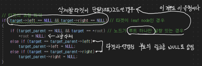 간단하다. 그냥 끝에 있는 노드이므로 바로 삭제를 하면 되는데, 다만! 삭제할 타겟의 부모의 링크(left or right)가 NULL을 가리키도록 설정해주면 된다. 다음의 그림과 같이 말이다.