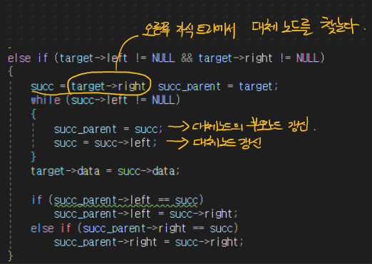 이에 따른 코드는 아래와 같으며, 타겟 노드를 루트 노드로 한 서브 트리의 오른쪽 자식의 서브 트리 군에서 가장 작은 값을 선택하여 타겟 노드의 자리에 대체하기로 하였다.
