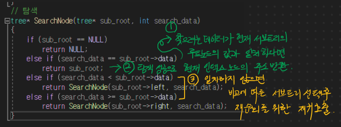 매개 변수인 sub_root에는 서브 트리의 루트 노드가 항상 들어온다. 이 서브 트리의 루트 노드와 값을 비교하여 같으면 탐색 완료, 작으면 다시 왼쪽 서브 트리 재탐색을 위한 재귀 호출, 크면 다시 오른쪽 서브 트리 재탐색을 위한 재귀 호출 순서로 조건 및 연산 수행을 진행하면 된다.