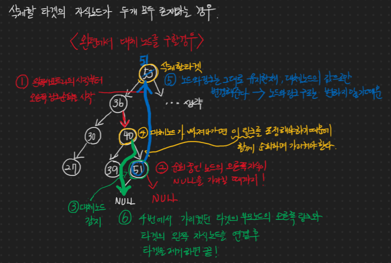 삭제할 타겟 노드가 자식 노드를 두 마리나(?) 가지고 있는 바람에 왼쪽 자식 노드의 서브 트리와 오른쪽 자식 노드의 서브 트리를 만족할 수 있는 값으로 대체 노드 선별해야한다.