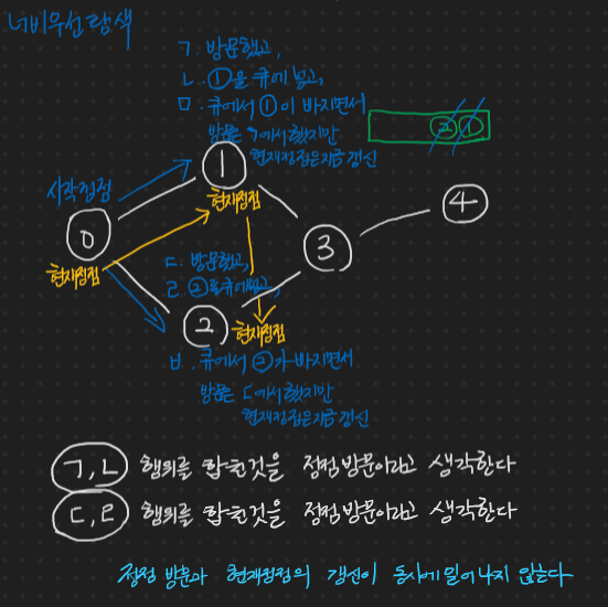 위의 예에서 현재 정점이 0이고 (ㄱ, ㄴ)처럼 1 정점을 방문한 뒤 바로 현재 정점으로 갱신을 해버리면 0 정점에 연결되어 있던 2 정점에 접근할 수 있는 기회가 사라진다. 그렇기 때문에 정점의 방문과 현재 정점의 갱신이 동시에 발생하지 않는 것이다.
