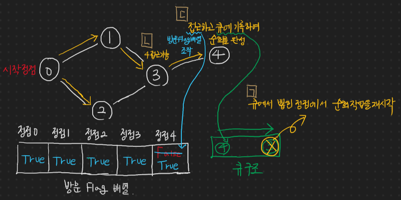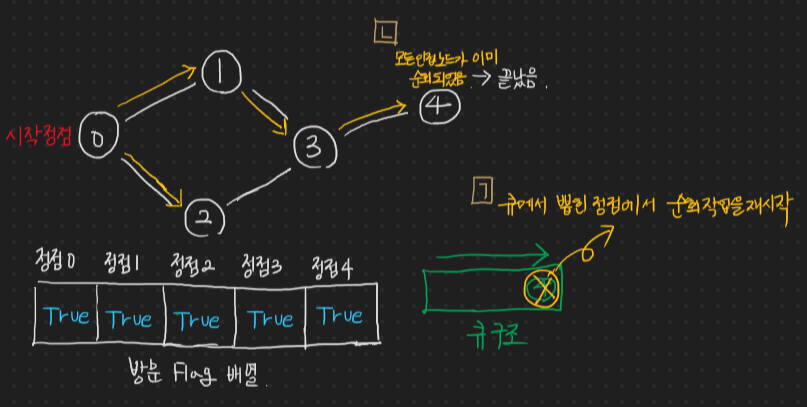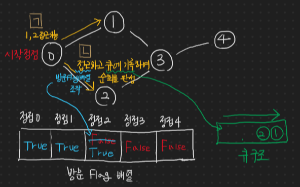 정점 0은 시작 정점이므로 일단 방문 처리가 자동으로 된다. 정점 방문에 해당하는 부분이 순회라는 표현이고, 이는 접근 + 큐 기록 까지를 의미한다. 접근했다는 의미 또한 방문 Flag 배열에 값을 갱신하는 조작을 의미하는 것이다.