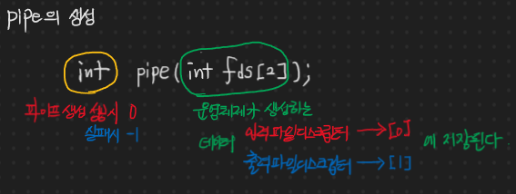 파이프의 생성은 위와 같은 함수로 진행된다. 운영체제에서 생성되는 공간이기 때문에 프로세스들과는 무관한 독립된 공간이고, fork 시 코드에 포함이 되어 있더라도 복제되는 메모리 공간이 아니다.
