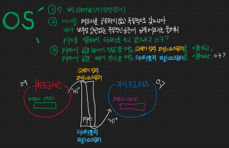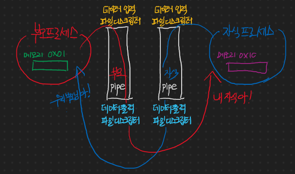 이게 바로 파이프를 이용한 프로세스 간의 통신을 간략하게 그림으로 그려본 것이다.