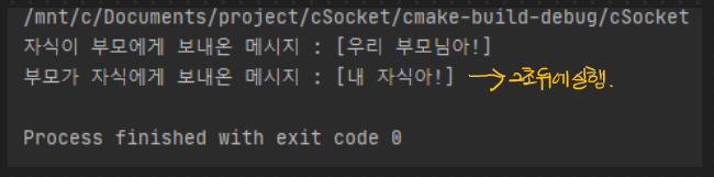 그리고 40번 라인의 부모 프로세스 실행 영역에서 5초 정도의 여유를 준 이유는 부모 프로세스가 종료하면 자식 프로세스도 함께 죽기 때문에 자식 프로세스가 충분히 부모가 전송한 데이터를 꺼낼 시간을 기다리기 위해서 5초의 여유를 준 것이다.
