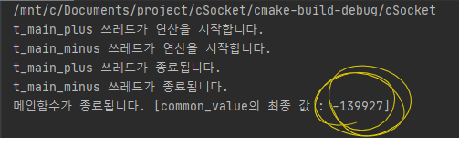 t_main_plus에서는 백만번을 더하고, t_main_minus에서는 백만번을 빼니까 결국 둘이 상쇄되서 0이 되는 것이 정상 아닌가? 싶지만 결과를 확인해보자.