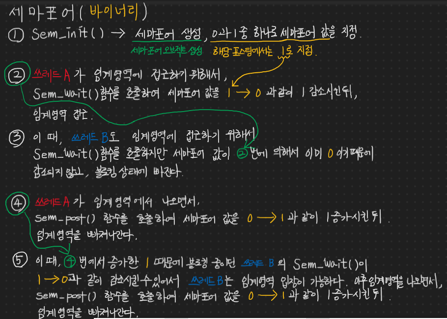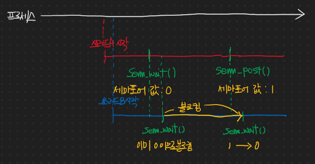 쓰레드 A가 먼저 sem_wait() 함수를 호출하여 임계 영역에 접근한 상태에서 쓰레드 B가 sem_wait() 함수를 호출하여 블로킹에 걸렸다가, 쓰레드 A가 sem_post() 함수를 호출하여 쓰레드 B가 sem_wait() 함수 처리 가능 상태가 되어서 이를 호출하고, 쓰레드 B가 임계 영역에 접근한 뒤, sem_post() 함수를 호출하여 쓰레드 B가 임계 영역에서 빠져나오는 과정을 설명한 것이다.