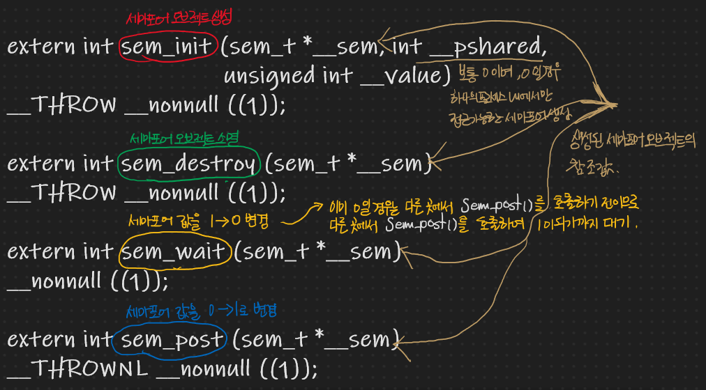 // 세 번째 인자를 0으로 넣으면 sem_wait을 먼저 호출한 쓰레드에서 블로킹이 발생하는 것을 확인할 수 있다.