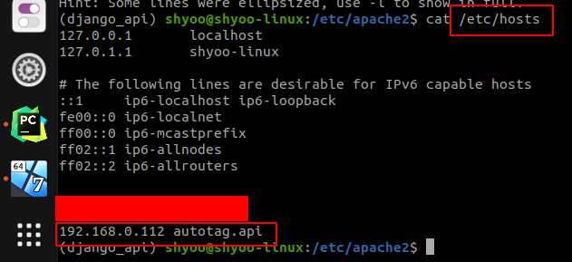 /etc/hosts 파일을 다음과 같이 수정하게 되면 autotag.api 라는 주소는 앞으로 192.168.0.112로 바꿔서 해석하겠다 라는 의미를 갖는다.