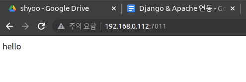위와 같이 깔끔하게 접속이 잘 된 모습을 볼 수 있다. 해당 페이지는 “hello” 를 출력하는 페이지 파일을 001-autotag.api.conf 의 DocumentRoot 경로에 기술한 경로에 사전에 집어넣어 렌더링 된 상태이다.
