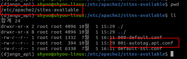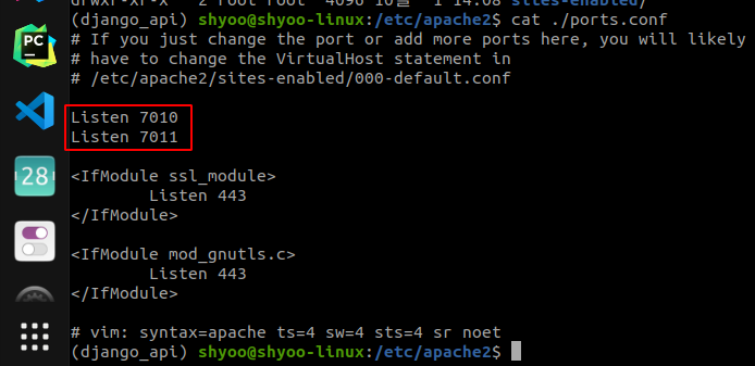 위와 같은 경로에 ports.conf 파일이 존재하는데 이 부분에 해당 Virtual Host 공간의 접속 포트를 추가하면 된다. 위 과정 중에서 sites-available 디렉토리 내에 001-autotag.api.conf 의 가장 첫 줄에 포트 번호가 있다. 그 번호를 추가한다.