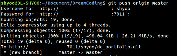 이제 드디어 원격 서버의 git 프로젝트에 업로드하는 과정이다. origin master 는 때에 따라 다르다. 나중에 필요에 의해 작성할 것.