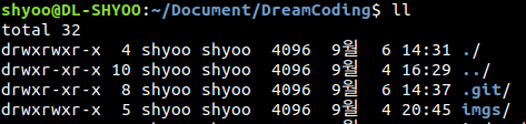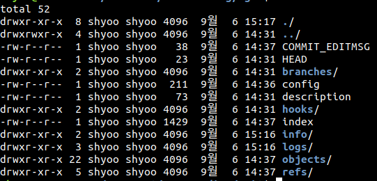 위의 명령을 작성하면 다음과 같이 ".git" 디렉토리가 생성된다. 숨겨진 파일로 생성된다는 뜻이다.