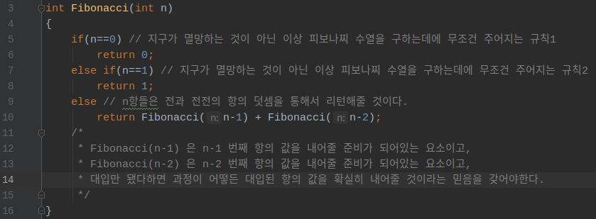 이게 진짜 개중요하다. 우리는 앞으로 만들 우리의 Fibonacci 함수를 믿어야 한다. 우리는 Fibonacci 함수의 인자로 원하는 항의 인덱스 값을 넣으면 해당 인덱스 항의 값을 내어준다는 사실을 믿어야한다. 믿음이다. 재귀 함수 루틴이 들어간다고 해서 이러한 사실이 부정인가? 아니다.