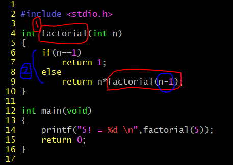 재귀 함수의 간단한 예이다. 재귀 함수의 필수 구성 요소는 다음과 같다.