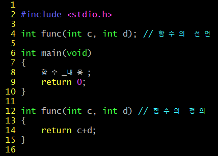 위와 같이 함수를 main 함수 밑에서 정의할 때, main 함수 내에서 함수의 호출이 정의보다 앞서는 이유로 함수가 존재 하지 않는다는 에러가 발생하는데 이 때 main 함수 상단의 선언을 통해서 정의가 밑에 있음을 컴파일러에게 명시하여 문제를 해결한다.