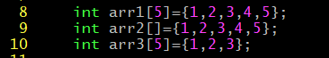 여기에서 우리는 중괄호 내의 초기화 값 리스트를 ‘초기화 리스트’ 라 부른다. 8번 라인의 경우에는 일반적인 선언과 동시의 초기화 방법이다. 9번 라인의 경우는 배열의 길이 정보가 주어지지 않은 상태인데 이는 초기화 리스트를 보고 자동으로 계산하여 배열의 길이가 세팅 된다. (위의 예에서는 5) 마지막으로 10번 라인의 경우는 배열의 길이보다 적은 초기화 리스트가 오게 되는데 0번째 인덱스부터 순차적으로 초기화 리스트의 값들이 할당되고 할당할 초기화 값이 없는 인덱스 요소에 대해서는 전부 0으로 자동 초기화한다.